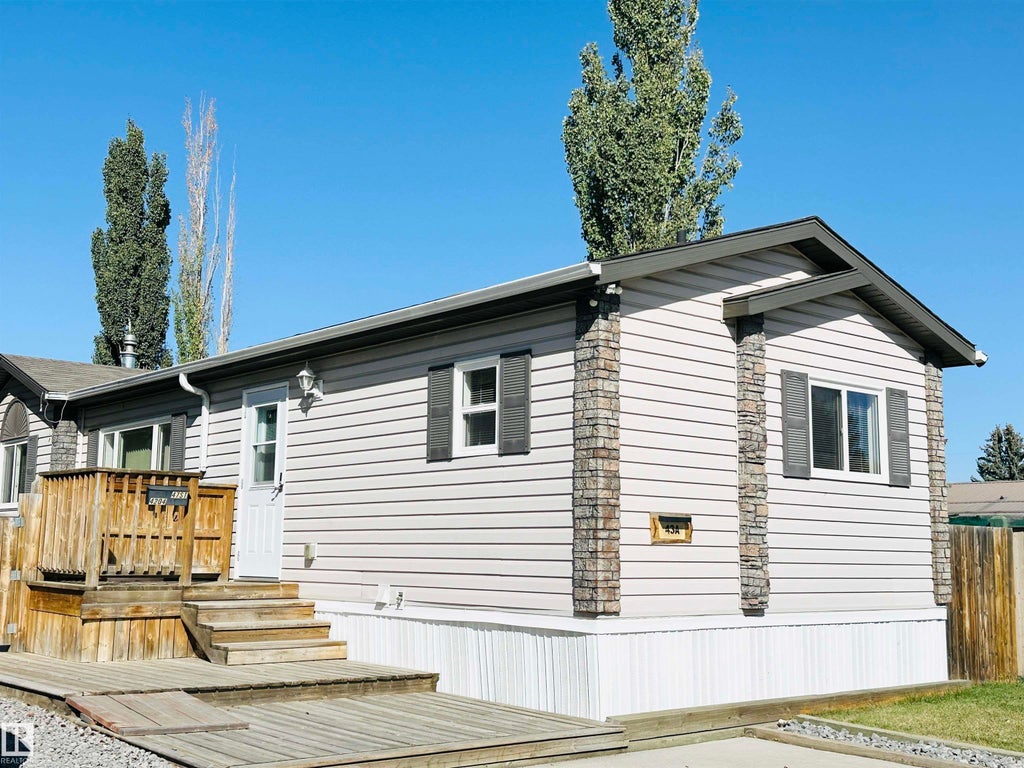 Searching for a home that combines simplicity with a touch of luxury? This modular home offers just that! With 1,216 square feet of living space, it features 3 bedrooms and 2 bathrooms. It also includes a built-in large deck and a sunroom equipped with a pool table for entertainment. Additionally, it is hook-up ready for a hot tub, offering even more potential for relaxation. The primary bedroom boasts a stunning 4-piece ensuite with a 2-person jetted tub and a separate shower. The kitchen comes equipped with a fridge, stove, dishwasher, and a deep freezer, all complemented by stained oak cabinets and a large island for extra storage, enhanced by a vaulted ceiling and skylight. The living room features laminate flooring, while the bedrooms are carpeted for added coziness. Attached to the home is a storage space that can be converted into a workspace or hobby room. Situated on a corner lot, the home is fully fenced, located next to schools and recreational facilities. This modular home is sure to impress!